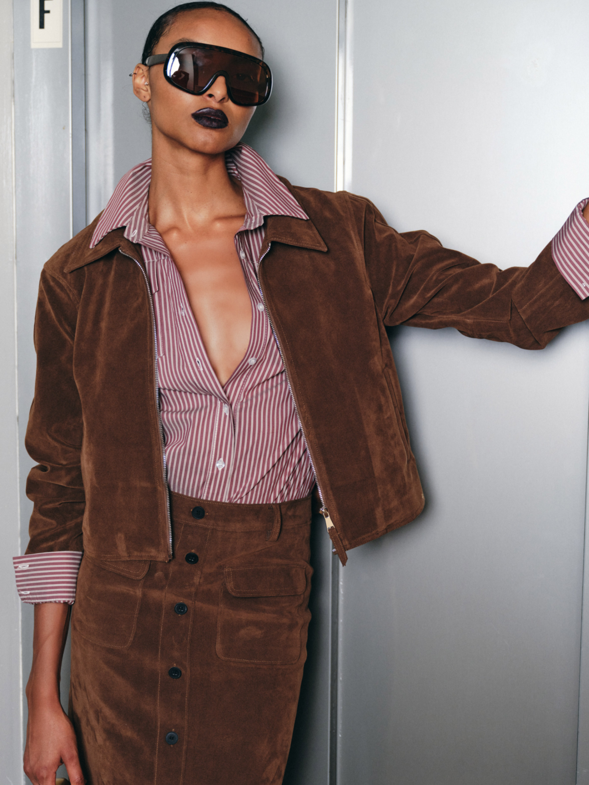 Esta chaqueta de corte recto combina un acabado de efecto ante con una cremallera funcional, ofreciendo una mezcla perfecta de estilo sobrio y practicidad. Su diseño minimalista y textura suave proporcionan una apariencia elegante y moderna, ideal para complementar cualquier conjunto con confort y distinción.
