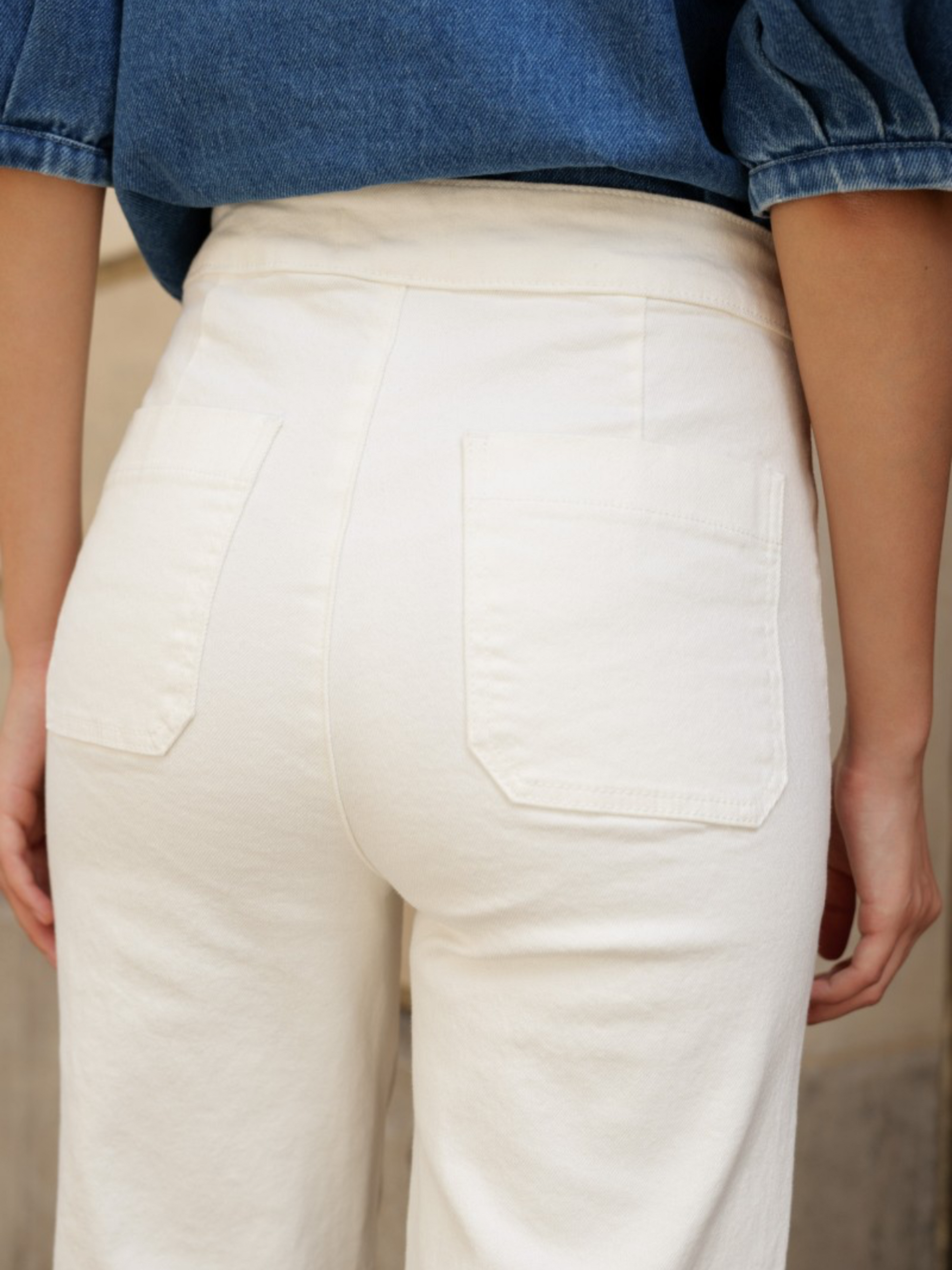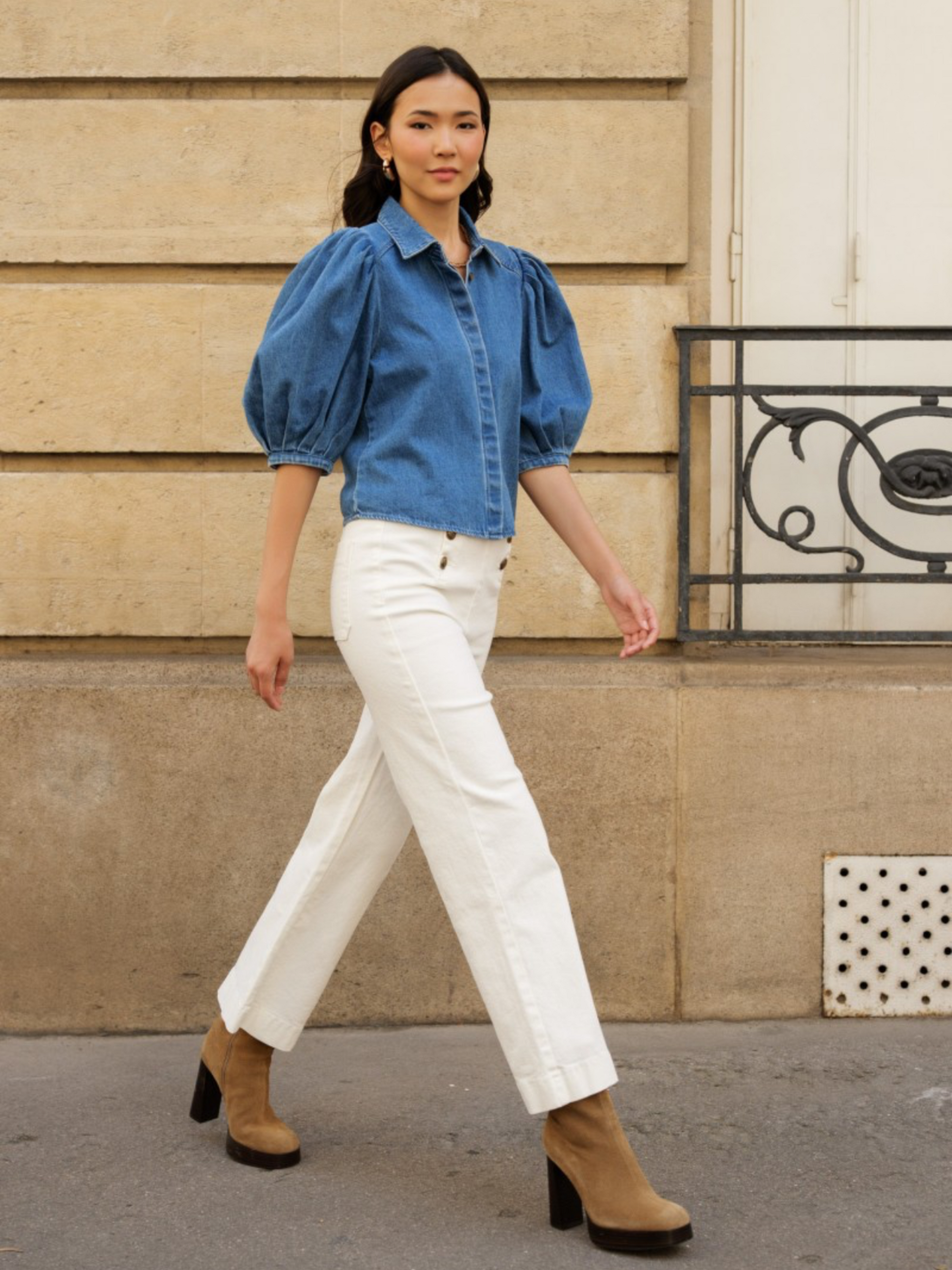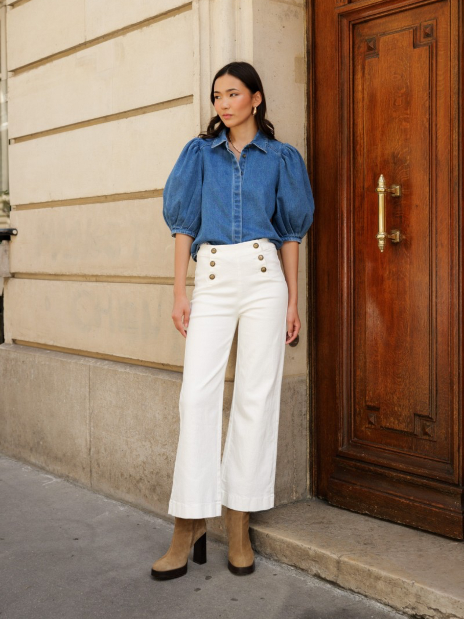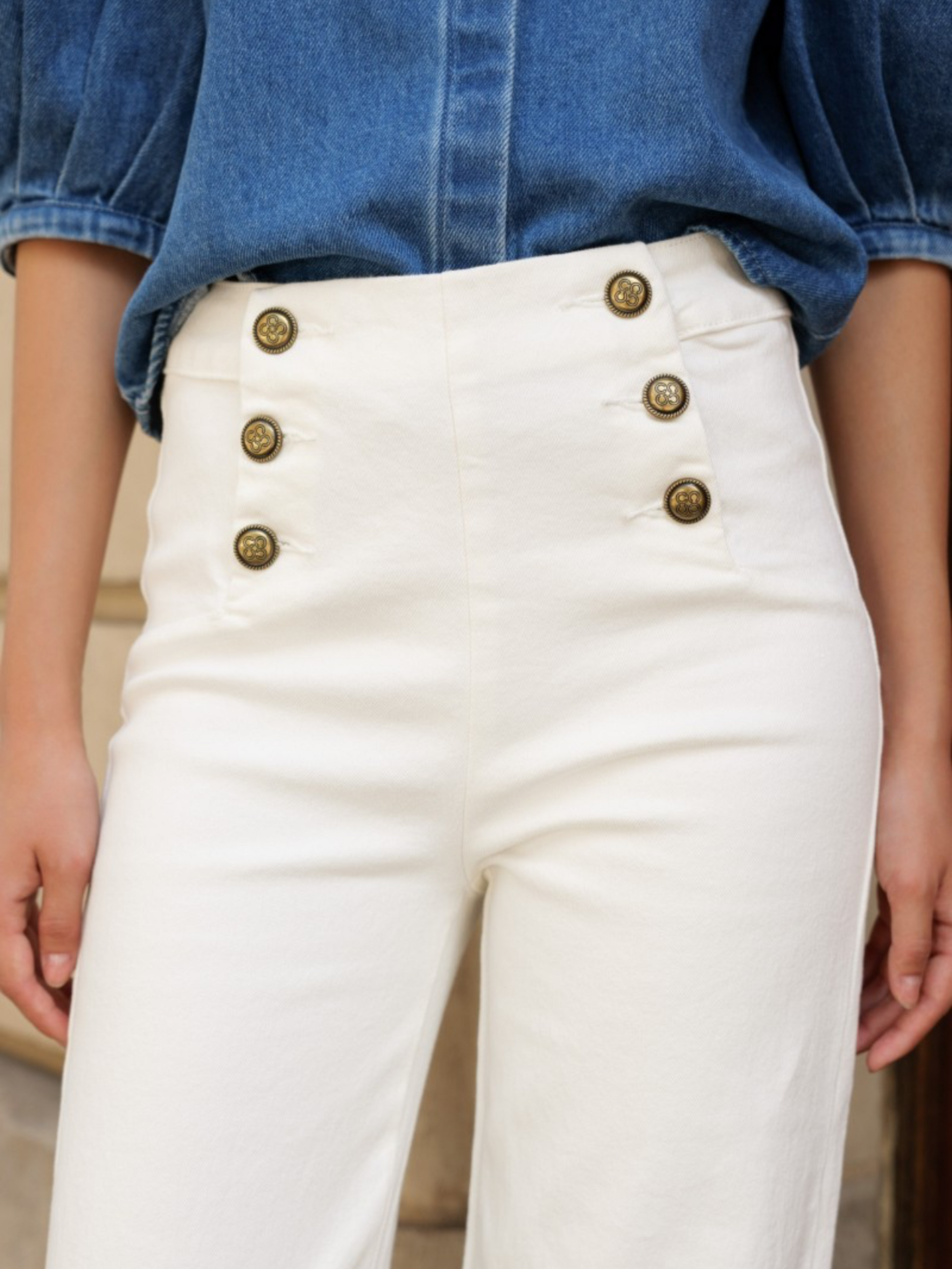 Los vaqueros Victorine han sido diseñados con detalles precisos que los hacen únicos: sus botones de puente. En este detalle reside la elegancia y originalidad de estos vaqueros. De hecho, la disposición de estos botones en una ligera diagonal permite afinar la cintura; además, si se observa con atención, sus botones de inspiración marinera le confieren un aspecto singular y reconocible.