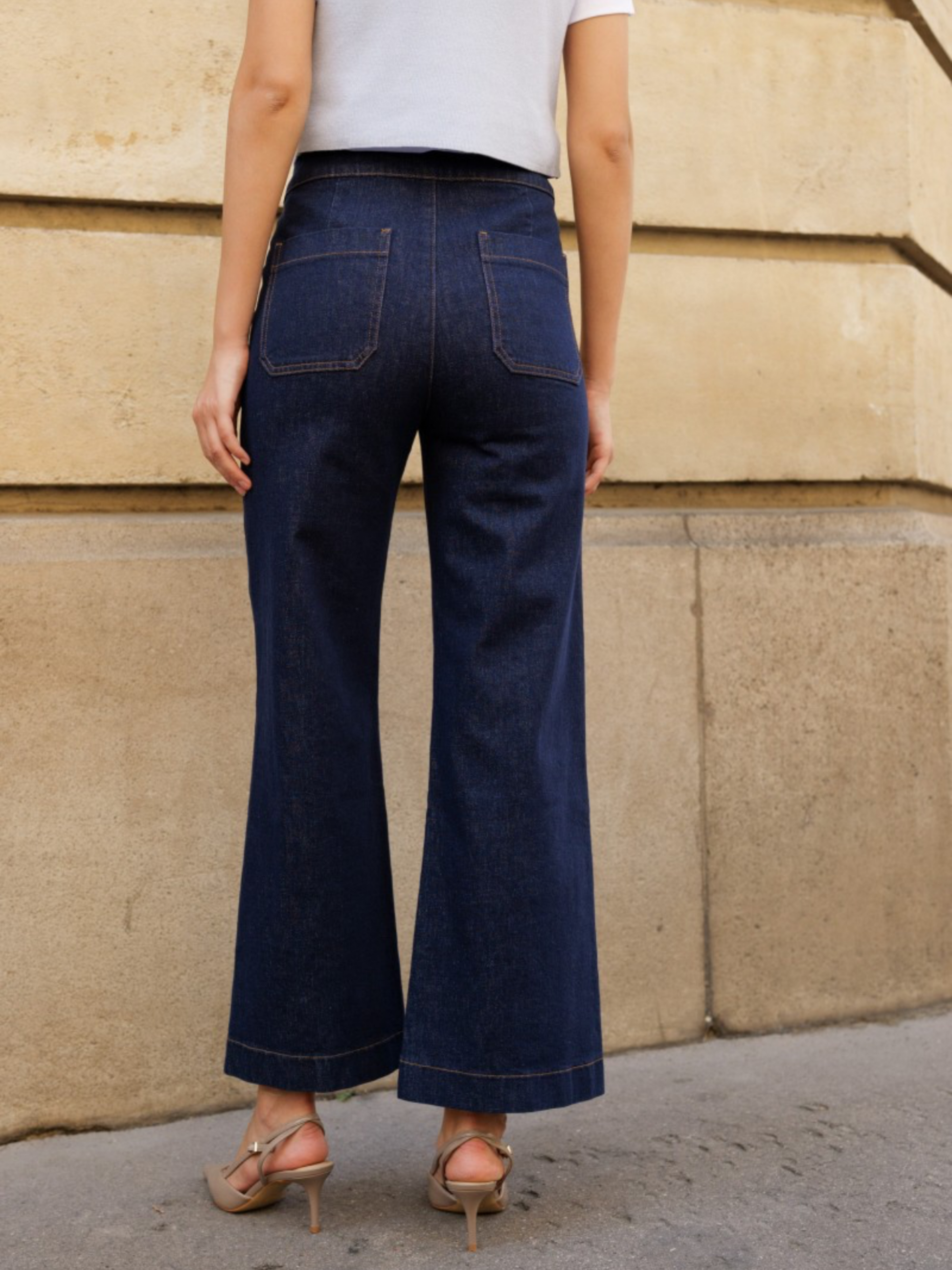 nuestros icónicos jeans: los Victorine. Son de pernera ancha, es decir, ajustados en la cintura y con vuelo desde la cadera hasta los tobillos. Su corte favorece a la mayoría de las siluetas.