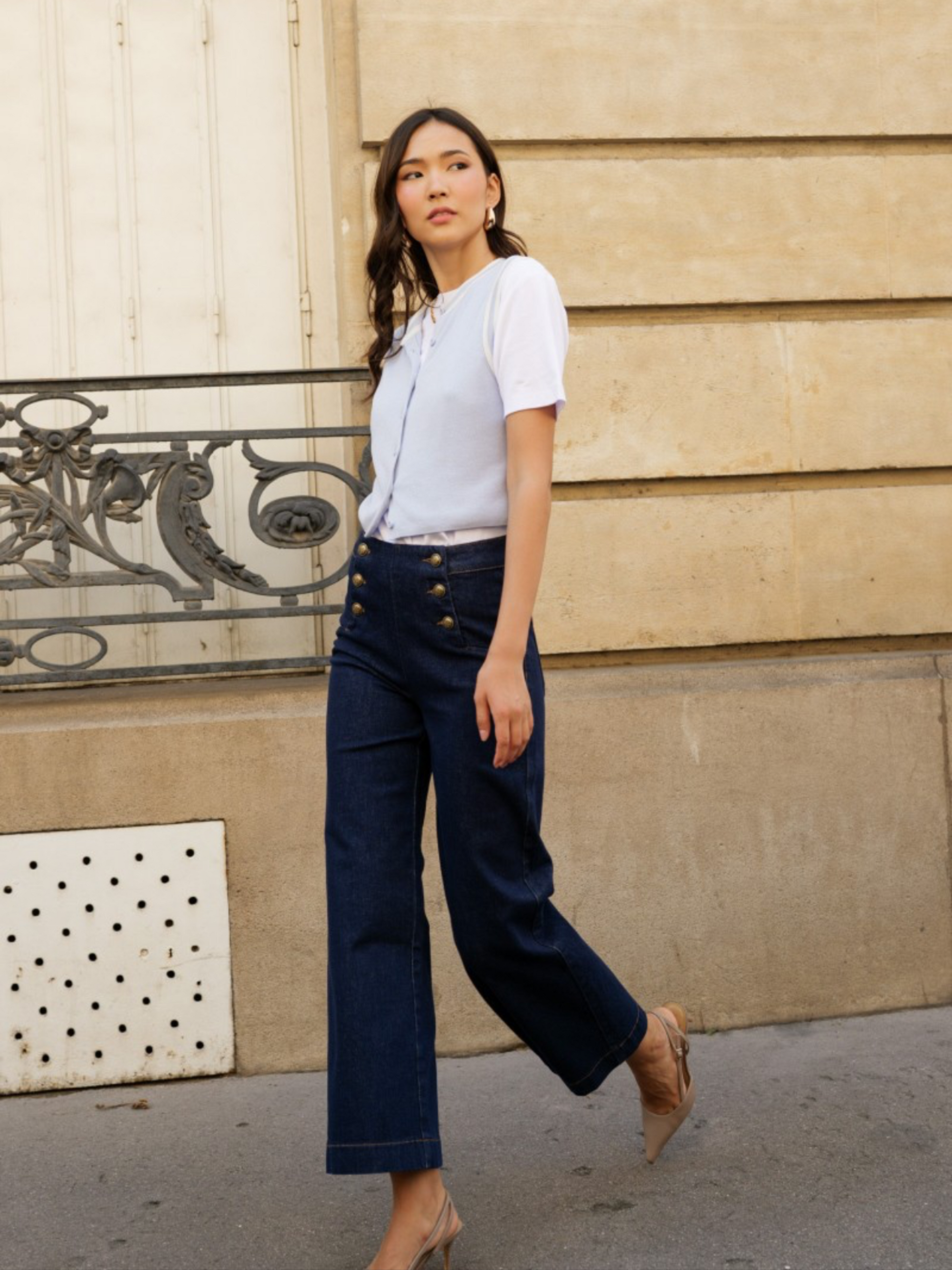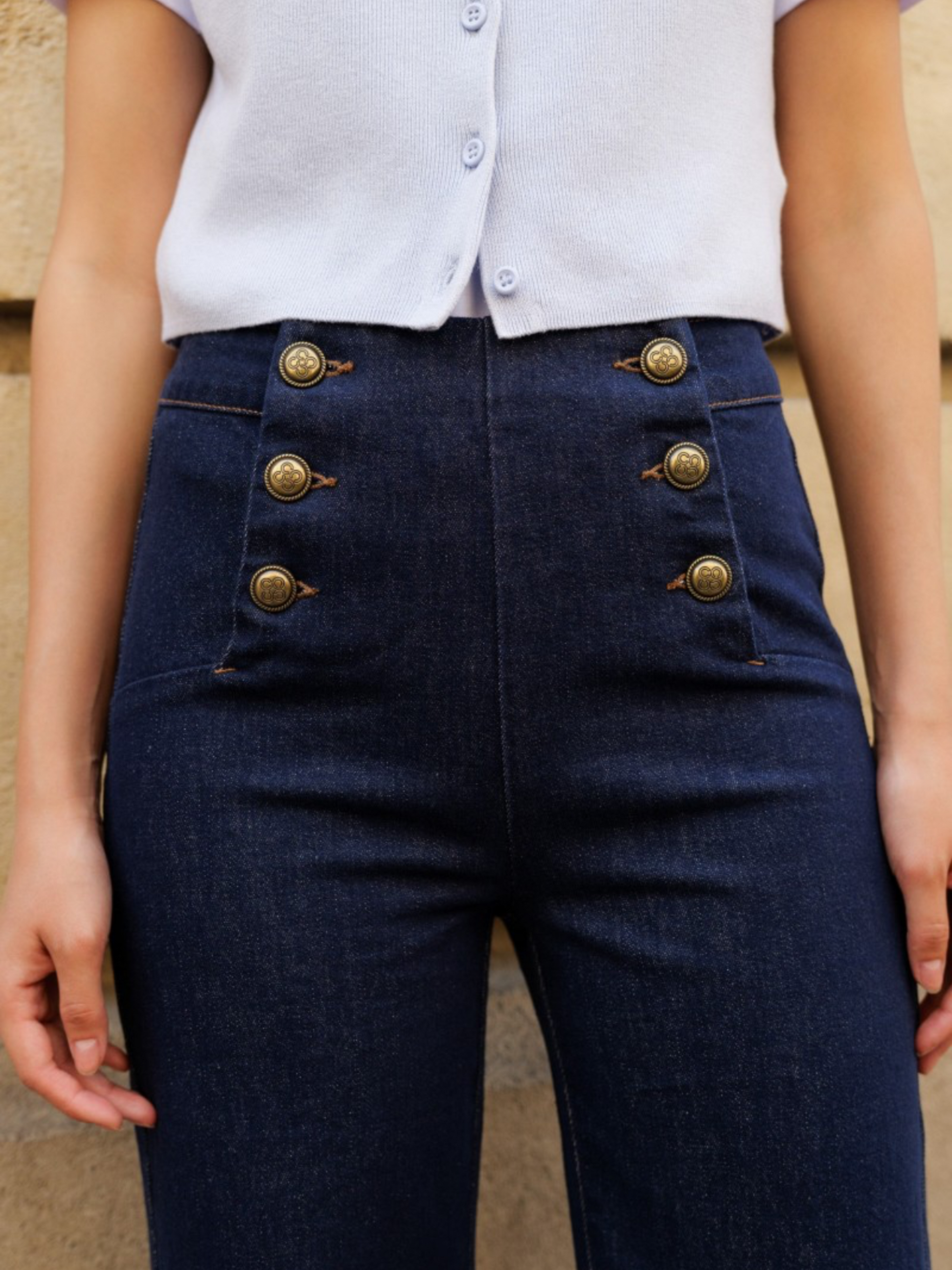 Los vaqueros Victorine han sido diseñados con detalles precisos que los hacen únicos: sus botones de puente. En este detalle reside la elegancia y originalidad de estos vaqueros. De hecho, la disposición de estos botones en una ligera diagonal permite afinar la cintura; además, si se observa con atención, sus botones de inspiración marinera le confieren un aspecto singular y reconocible.