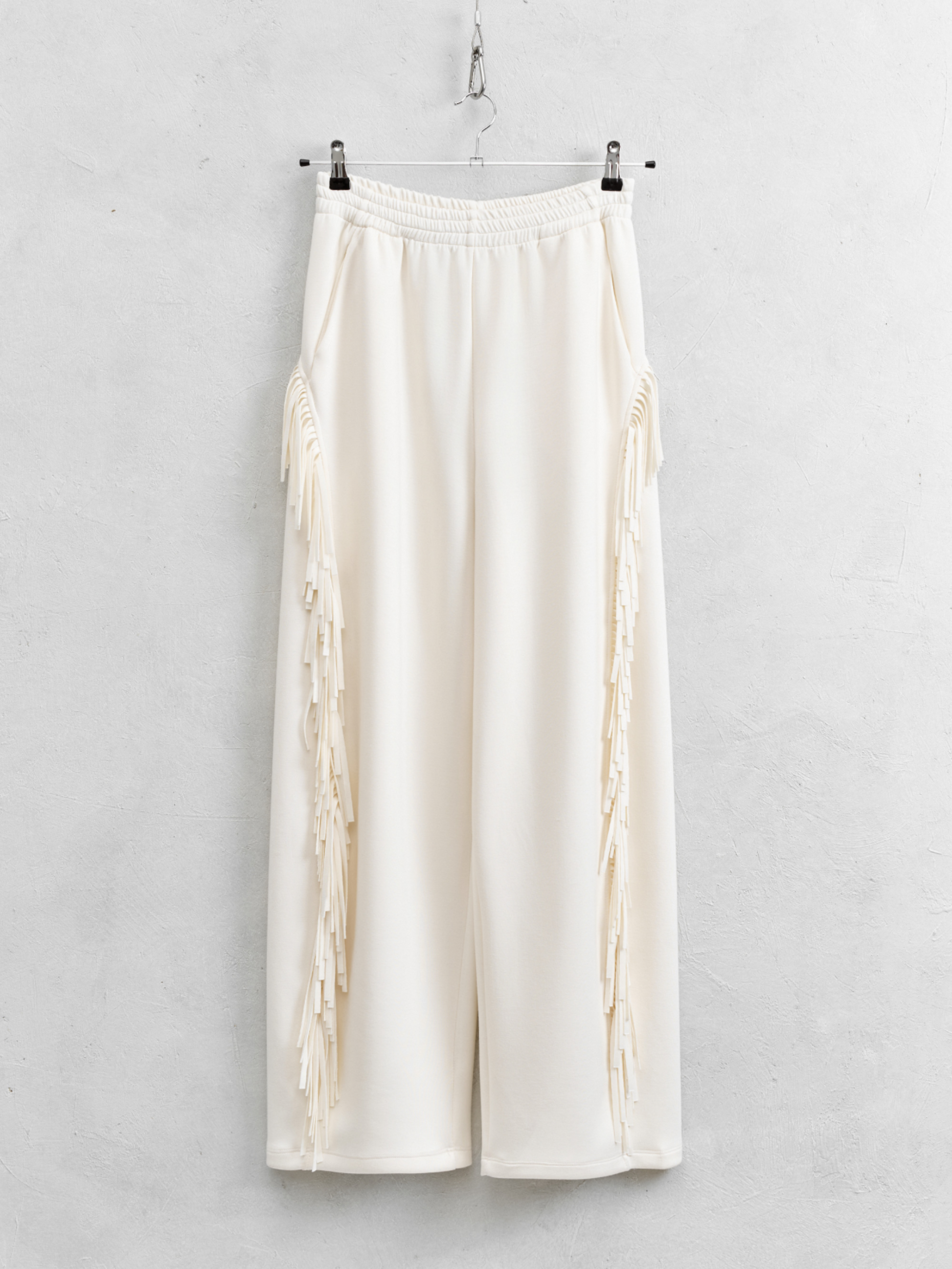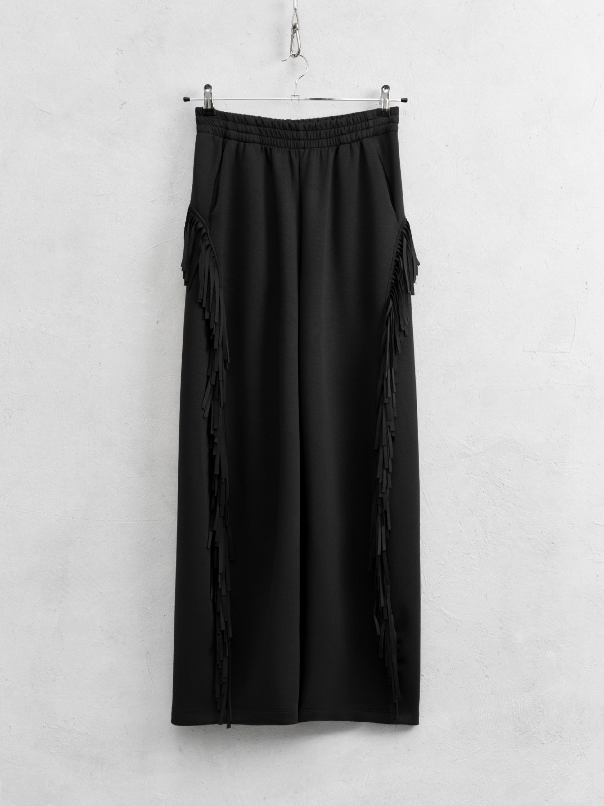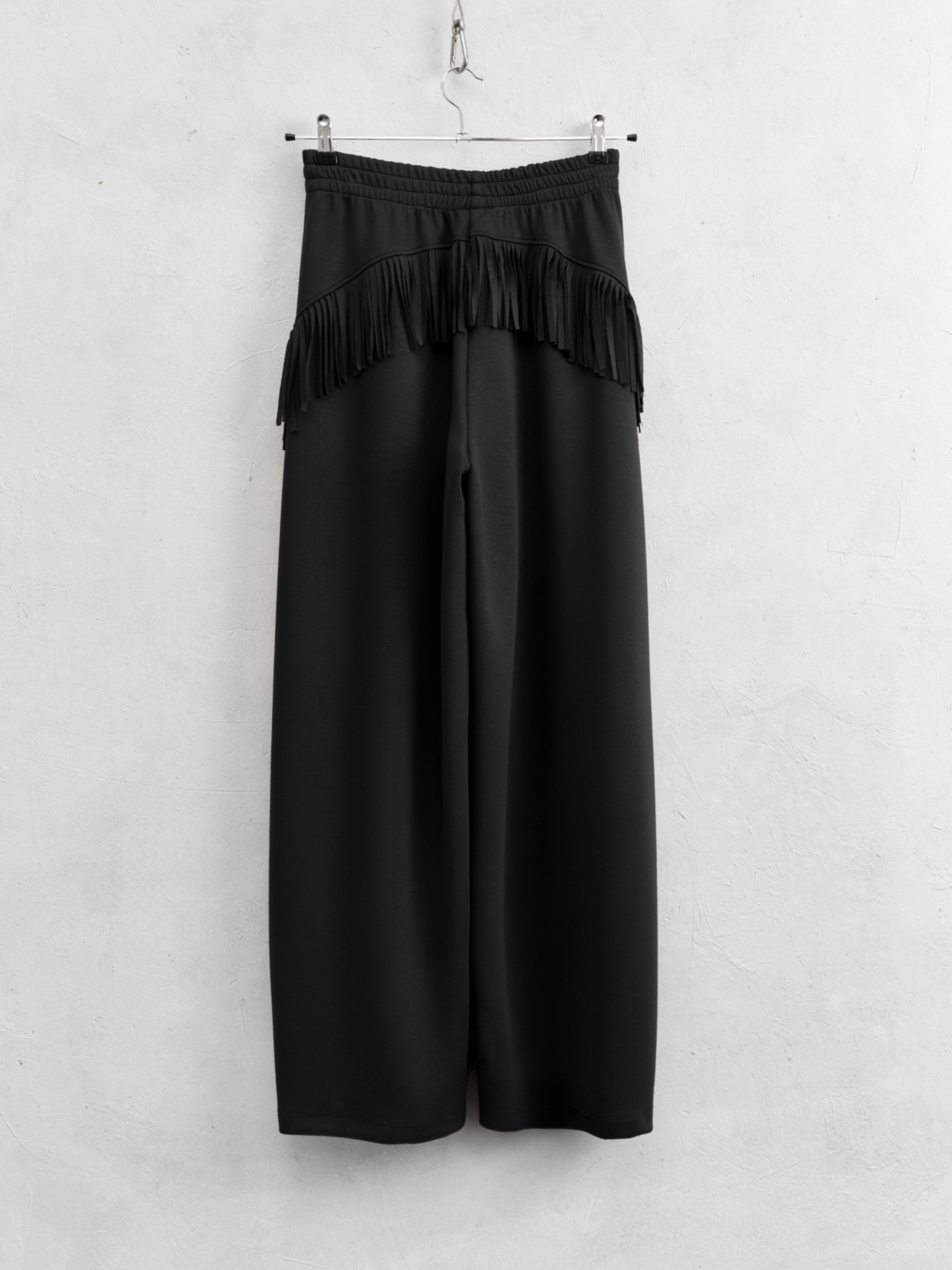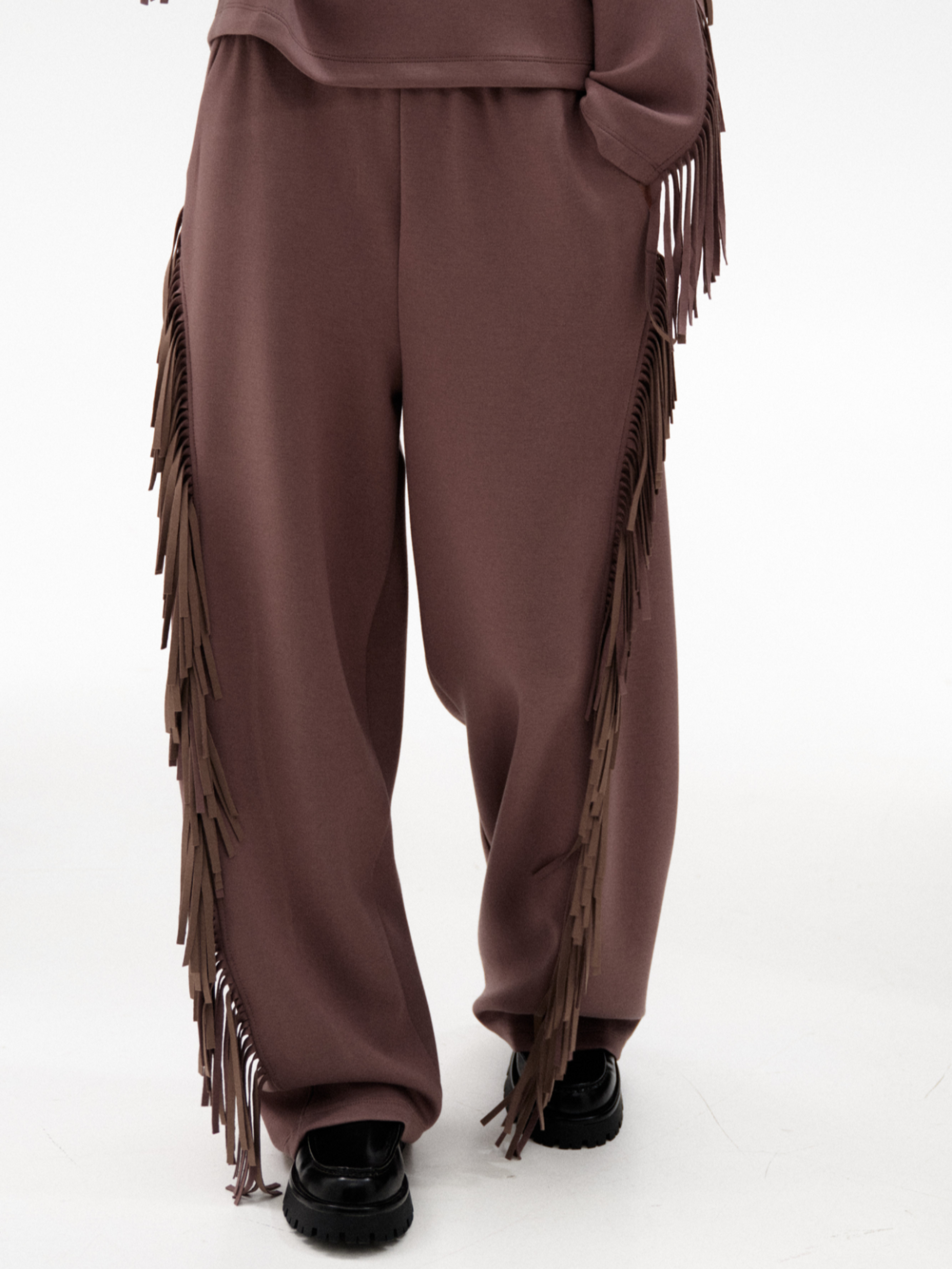Este pantalón sporty flecos fusiona comodidad y atrevimiento con un tejido fluido y un corte recto que favorece la silueta. Los flecos que descienden desde la parte trasera por los laterales aportan un movimiento vibrante y arriesgado. Combínalo con la sudadera y el cárdigan de flecos para crear un conjunto impactante y lleno de personalidad, listo para destacar en cualquier ocasión.