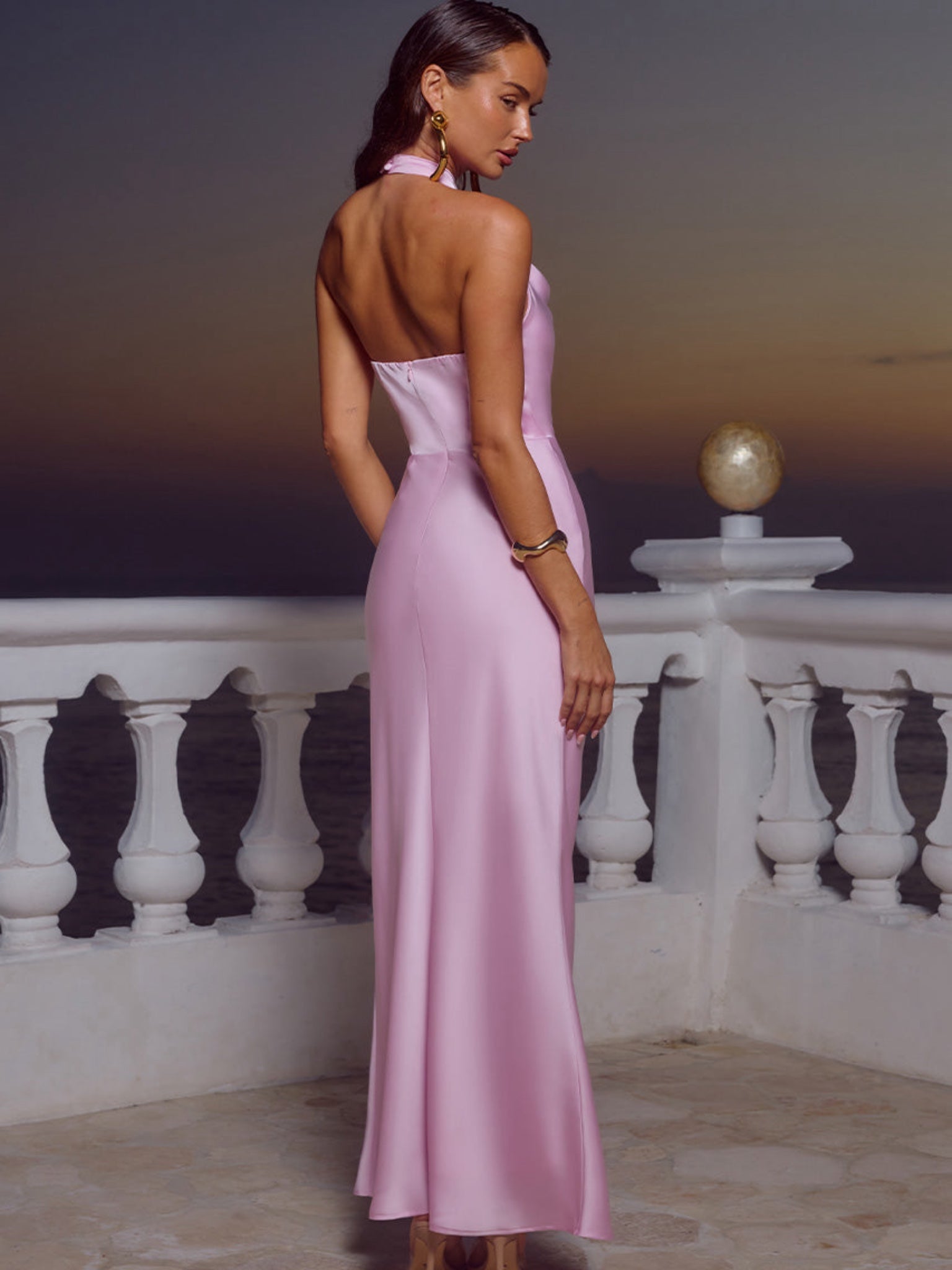 El vestido largo Estelle combina elegancia con un diseño femenino, presentado en un corte maxi que alarga la silueta. Su cuello halter destaca el escote vuelto, mientras que el broche de rosa añade un toque delicado y sofisticado. Cuenta con una cremallera invisible en el centro de la espalda para un ajuste perfecto y está completamente forrado, garantizando comodidad y estructura sin elasticidad. Ideal para ocasiones especiales donde se busca un estilo refinado y atemporal.